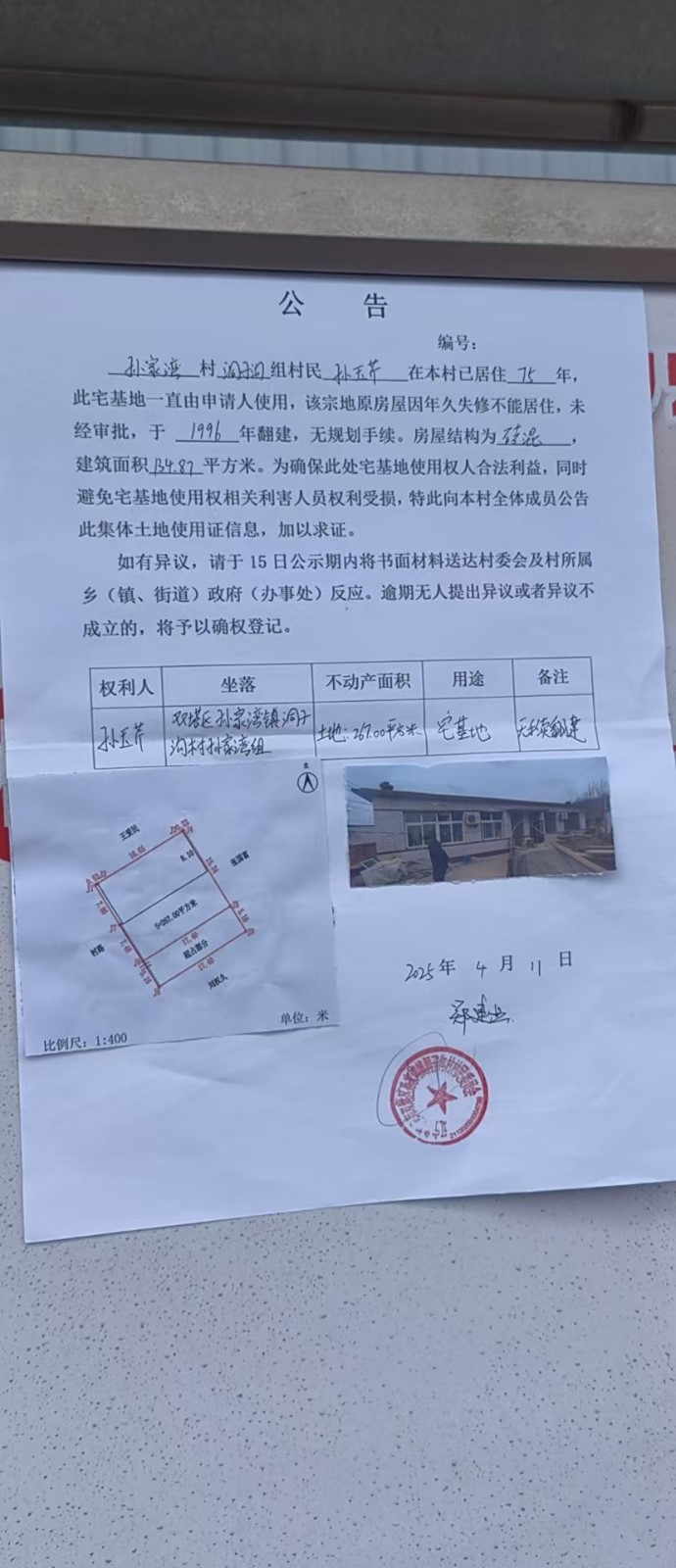 关于洞子沟村村民孙玉芹住宅的确权公告